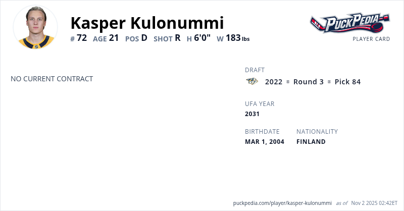 Kulonummi was selected 84th overall by the Nashville Predators in the 2022 NHL Entry Draft on Friday.