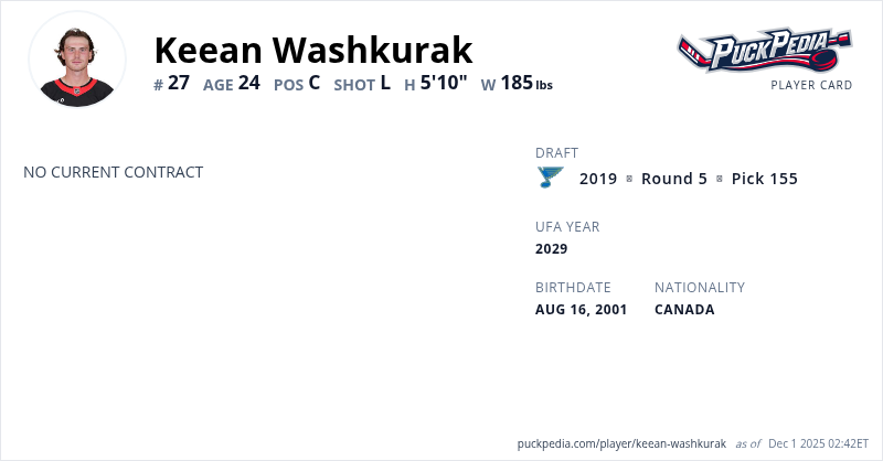Keean Washkurak is an Unrestricted Free Agent (No Qualifying Offer). His last contract was 3 years, $2,587,500 with a cap hit of $862,500 per season. It expired at the end of the 2023-24 season.