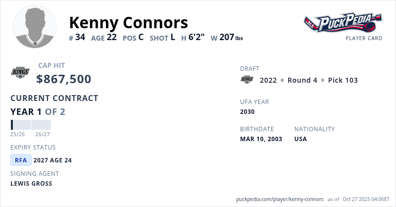 Kenny Connors is signed to a 2 year, $1,735,000 contract with a cap hit of $867,500 per season, playing for the Los Angeles Kings. His contract expires at the end of the 2026-27 season, making Connors a Restricted Free Agent.