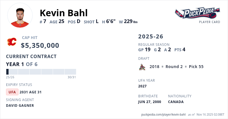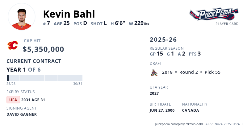Kevin Bahl is signed to a 6 year, $32,100,000 contract with a cap hit of $5,350,000 per season, playing for the Calgary Flames. His contract expires at the end of the 2030-31 season, making Bahl an Unrestricted Free Agent.