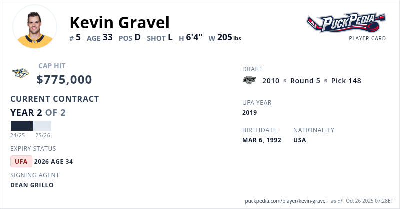 Kevin Gravel is signed to a 2 year, $1,550,000 contract with a cap hit of $775,000 per season, playing for the Nashville Predators. His contract expires at the end of the 2025-26 season, making Gravel an Unrestricted Free Agent.