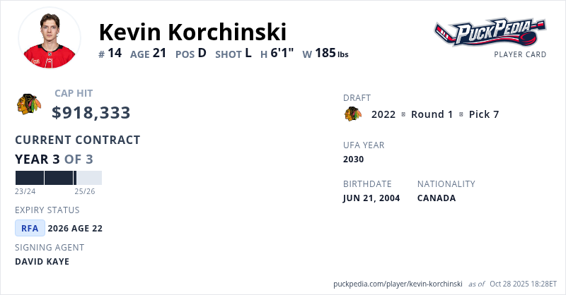 Kevin Korchinski is signed to a 3 year, $2,754,999 contract with a cap hit of $918,333 per season, playing for the Chicago Blackhawks. His contract expires at the end of the 2025-26 season, making Korchinski a Restricted Free Agent.