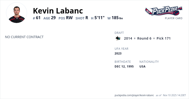 Kevin Labanc is an Unrestricted Free Agent. His last contract was 1 year, $775,000 with a cap hit of $775,000 per season. It expired at the end of the 2024-25 season.