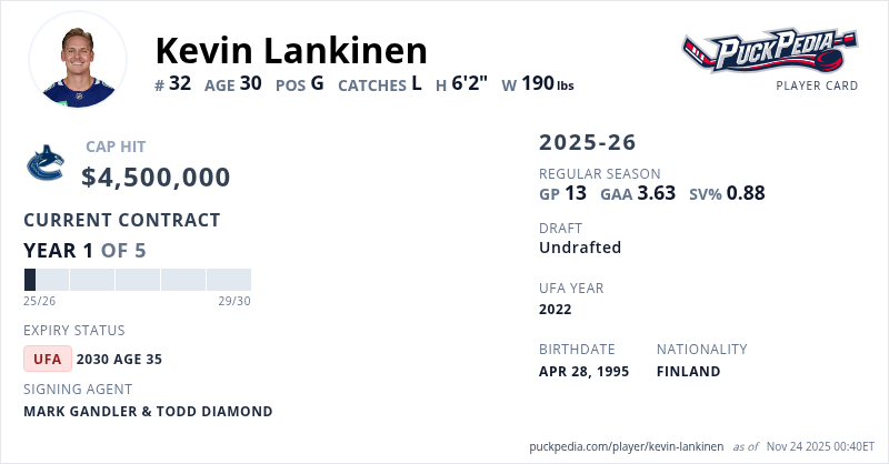 Kevin Lankinen is signed to a 5 year, $22,500,000 contract with a cap hit of $4,500,000 per season, playing for the Vancouver Canucks. His contract expires at the end of the 2029-30 season, making Lankinen an Unrestricted Free Agent.