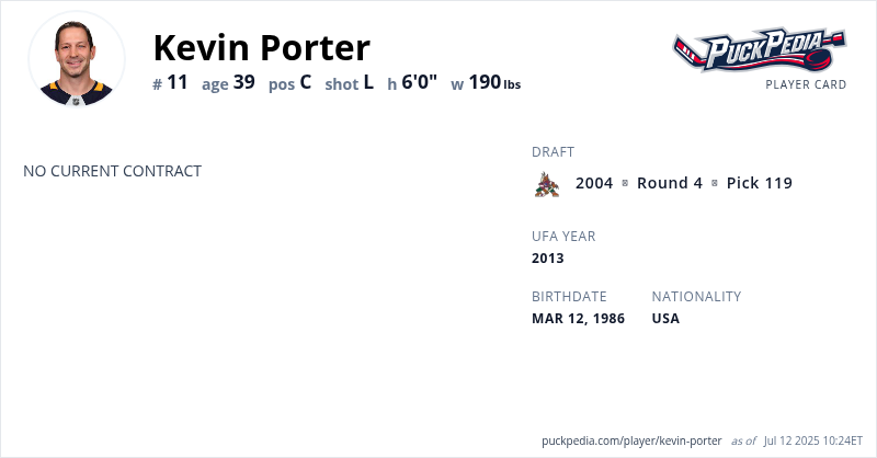 Kevin Porter is an Unrestricted Free Agent. His last contract was 2 years, $1,300,000 with a cap hit of $650,000 per season. It expired at the end of the 2018-19 season.