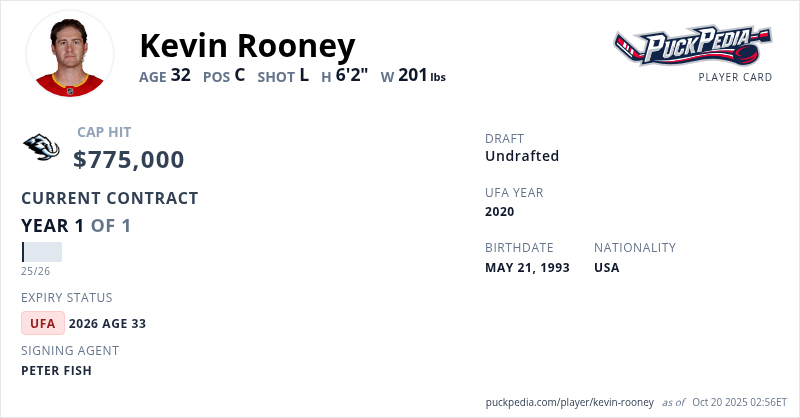 Kevin Rooney is signed to a 1 year, $775,000 contract with a cap hit of $775,000 per season, playing for the Utah Mammoth. His contract expires at the end of the 2025-26 season, making Rooney an Unrestricted Free Agent.