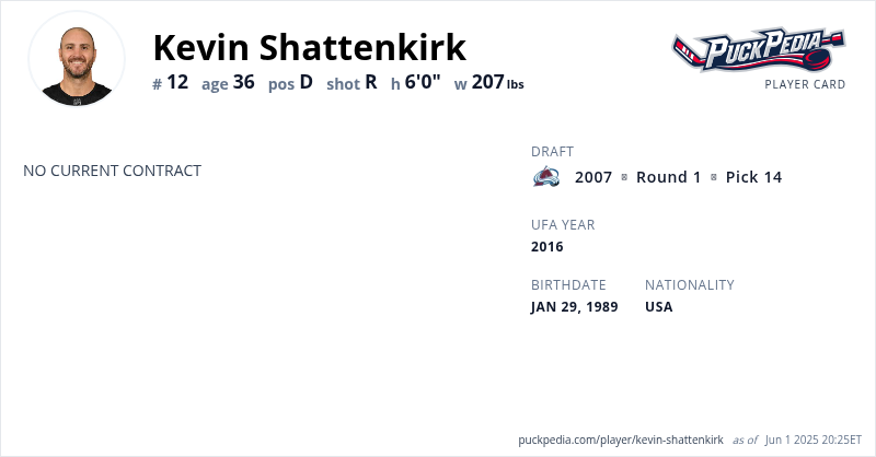 Kevin Shattenkirk is an Unrestricted Free Agent. His last contract was 1 year, $1,050,000 with a cap hit of $1,050,000 per season. It expired at the end of the 2023-24 season.