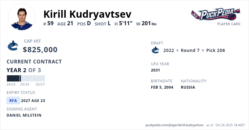 Kirill Kudryavtsev is signed to a 3 year, $2,475,000 contract with a cap hit of $825,000 per season, playing for the Vancouver Canucks. His contract expires at the end of the 2026-27 season, making Kudryavtsev a Restricted Free Agent.