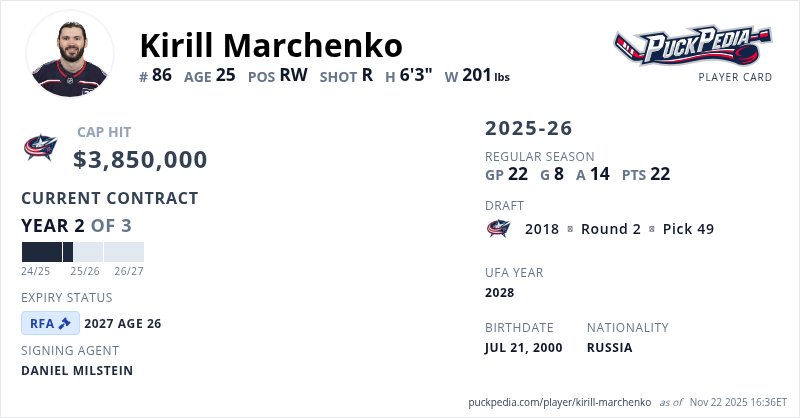 Kirill Marchenko is signed to a 3 year, $11,550,000 contract with a cap hit of $3,850,000 per season, playing for the Columbus Blue Jackets. His contract expires at the end of the 2026-27 season, making Marchenko a Restricted Free Agent.