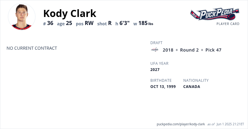 Kody Clark is an Unrestricted Free Agent (No Qualifying Offer). His last contract was 3 years, $2,425,002 with a cap hit of $808,334 per season. It expired at the end of the 2022-23 season.