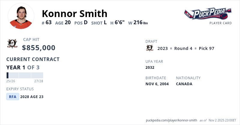 Konnor Smith is signed to a 3 year, $2,565,000 contract with a cap hit of $855,000 per season, playing for the Anaheim Ducks. His contract expires at the end of the 2027-28 season, making Smith a Restricted Free Agent.