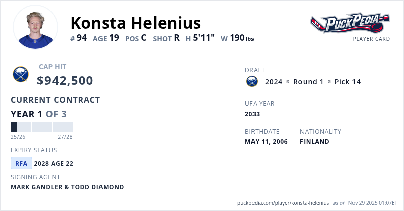 Konsta Helenius is signed to a 3 year, $2,827,500 contract with a cap hit of $942,500 per season, playing for the Buffalo Sabres. His contract expires at the end of the 2027-28 season, making Helenius a Restricted Free Agent.