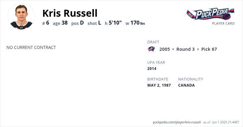 Kris Russell is an Unrestricted Free Agent. His last contract was 1 year, $1,250,000 with a cap hit of $1,250,000 per season. It expired at the end of the 2021-22 season.