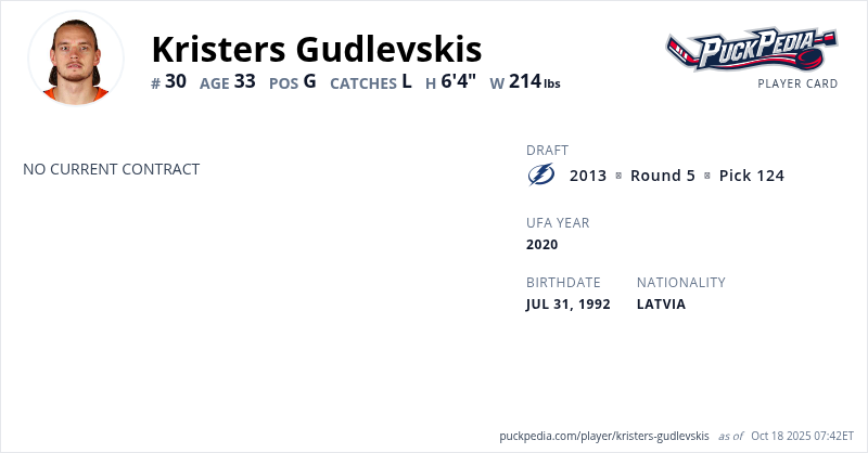 Kristers Gudlevskis is a Restricted Free Agent. His last contract was 1 year, $650,000 with a cap hit of $650,000 per season. It expired at the end of the 2017-18 season.