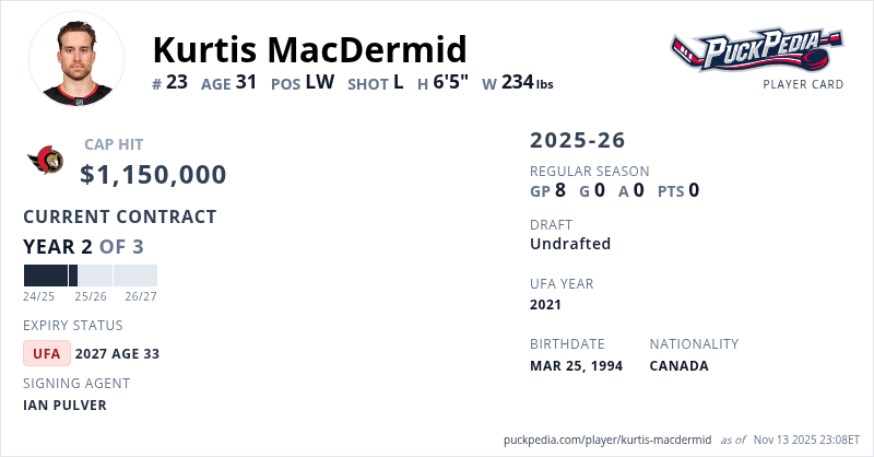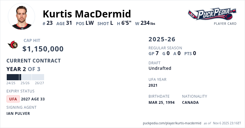 Kurtis MacDermid is signed to a 3 year, $3,450,000 contract with a cap hit of $1,150,000 per season, playing for the Ottawa Senators. His contract expires at the end of the 2026-27 season, making MacDermid an Unrestricted Free Agent.
