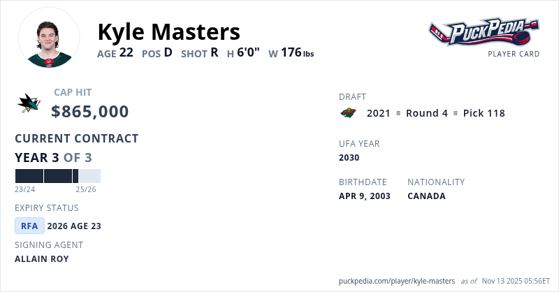 Kyle Masters is signed to a 3 year, $2,595,000 contract with a cap hit of $865,000 per season, playing for the San Jose Sharks. His contract expires at the end of the 2025-26 season, making Masters a Restricted Free Agent.