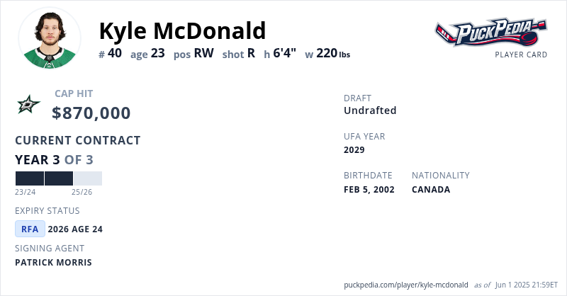 Kyle McDonald is signed to a 3 year, $2,610,000 contract with a cap hit of $870,000 per season, playing for the Dallas Stars. His contract expires at the end of the 2025-26 season, making McDonald a Restricted Free Agent.