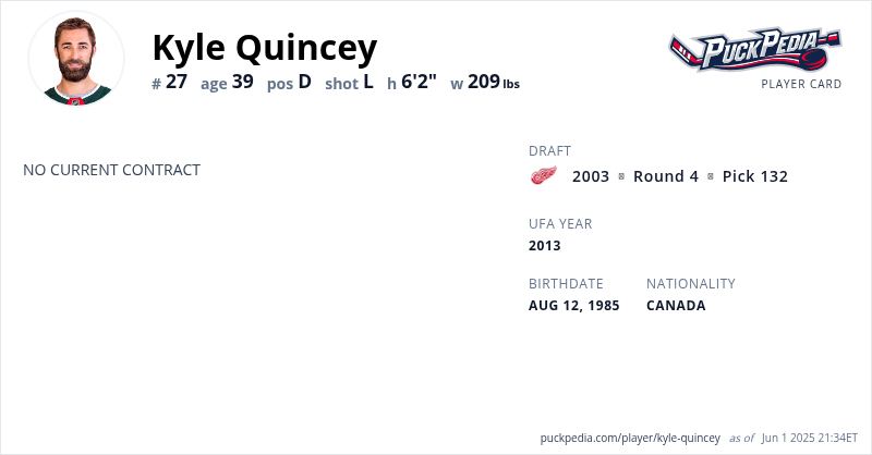 Kyle Quincey is an Unrestricted Free Agent. His last contract was 1 year, $1,250,000 with a cap hit of $1,250,000 per season. It expired at the end of the 2017-18 season.