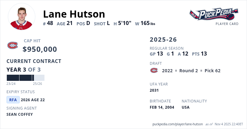 Lane Hutson is signed to a 8 year, $70,800,000 contract extension with a cap hit of $8,850,000 per season. He plays for the Montreal Canadiens. His next contract begins for the 2026-27 season and expires at the end of the 2033-34 season, making him an Unrestricted Free Agent.
