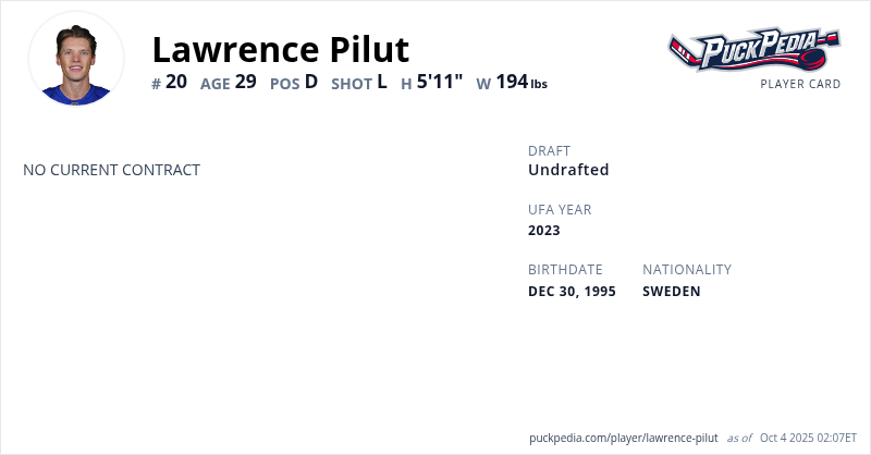 Lawrence Pilut is an Unrestricted Free Agent. His last contract was 1 year, $750,000 with a cap hit of $750,000 per season. It expired at the end of the 2022-23 season.