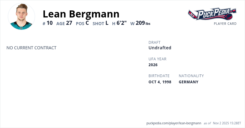 Lean Bergmann is a Restricted Free Agent. His last contract was 3 years, $2,510,001 with a cap hit of $836,667 per season. It expired at the end of the 2021-22 season.