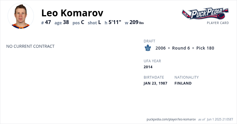 Leo Komarov is an Unrestricted Free Agent. His last contract was 4 years, $12,000,000 with a cap hit of $3,000,000 per season. It expired at the end of the 2021-22 season.