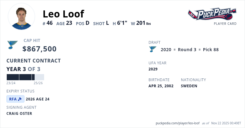 Leo Loof is signed to a 3 year, $2,602,500 contract with a cap hit of $867,500 per season, playing for the St. Louis Blues. His contract expires at the end of the 2025-26 season, making Loof a Restricted Free Agent.