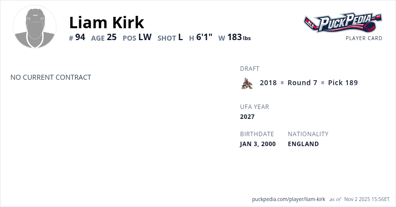 Liam Kirk is a Restricted Free Agent. His last contract was 3 years, $2,439,999 with a cap hit of $813,333 per season. It expired at the end of the 2023-24 season.