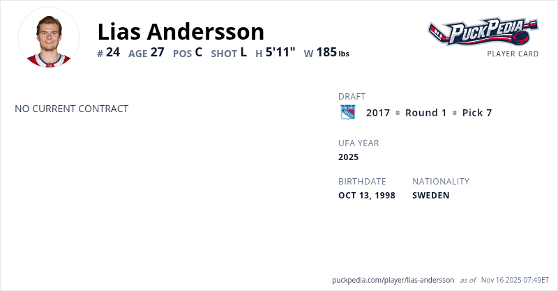 Lias Andersson is an Unrestricted Free Agent (No Qualifying Offer). His last contract was 1 year, $775,000 with a cap hit of $775,000 per season. It expired at the end of the 2023-24 season.