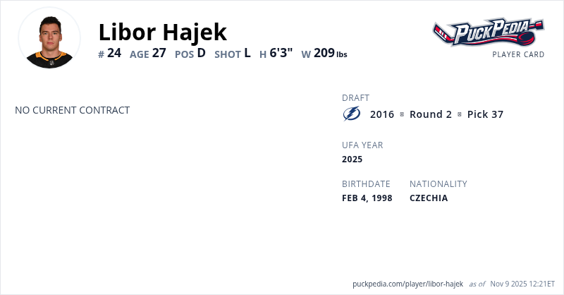 Libor Hajek is an Unrestricted Free Agent (No Qualifying Offer). His last contract was 1 year, $800,000 with a cap hit of $800,000 per season. It expired at the end of the 2022-23 season.