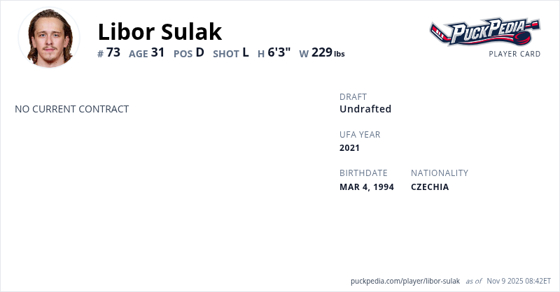 Libor Sulak is an Unrestricted Free Agent (No Qualifying Offer). His last contract was 2 years, $1,667,500 with a cap hit of $833,750 per season. It expired at the end of the 2018-19 season.