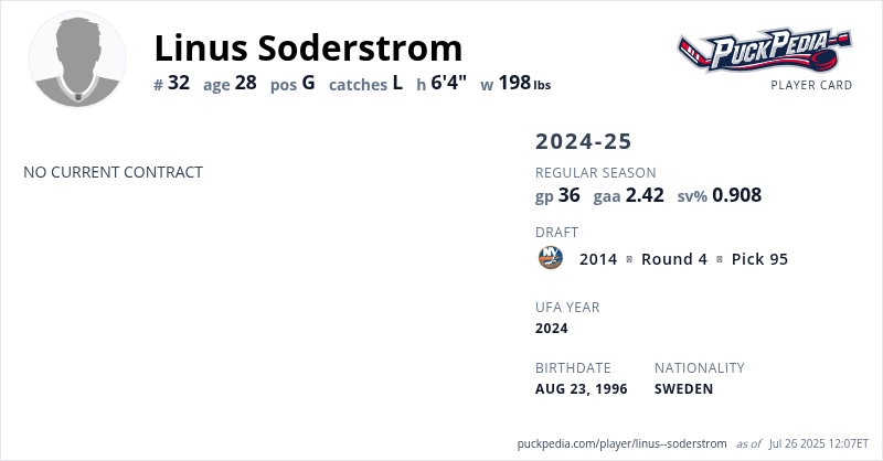 Linus Soderstrom is an Unrestricted Free Agent (No Qualifying Offer). His last contract was 3 years, $2,409,999 with a cap hit of $803,333 per season. It expired at the end of the 2019-20 season.