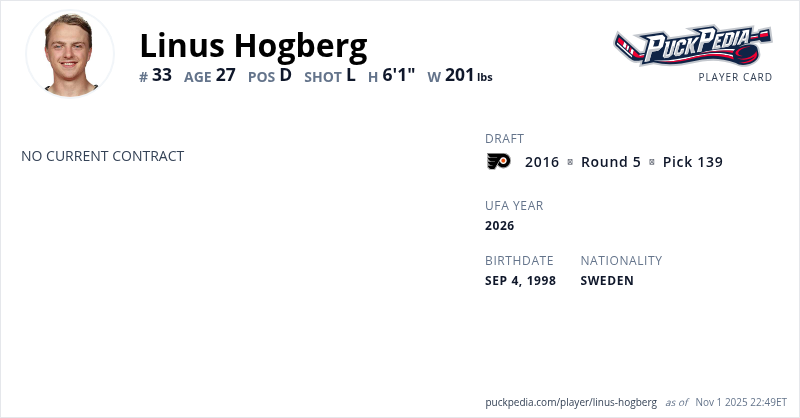 Linus Hogberg is a Restricted Free Agent. His last contract was 1 year, $750,000 with a cap hit of $750,000 per season. It expired at the end of the 2022-23 season.