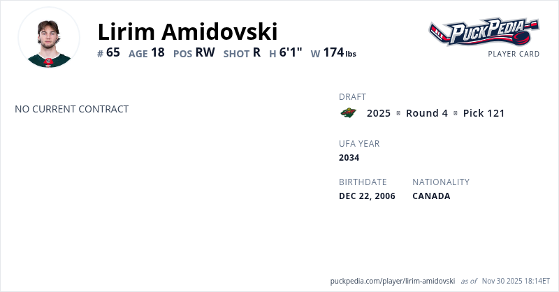 | 2024-25 | 18 | OHL | North Bay Battalion | 67 | 19 | 13 | 32 | 38 | Playoffs | 5 | 3 | 0 | 3 | 0 | ||||||||||||||||