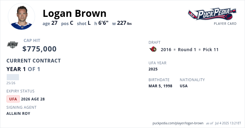 Logan Brown is signed to a 1 year, $775,000 contract with a cap hit of $775,000 per season, playing for the Los Angeles Kings. His contract expires at the end of the 2025-26 season, making Brown an Unrestricted Free Agent.