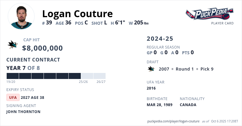 Logan Couture is signed to a 8 year, $64,000,000 contract with a cap hit of $8,000,000 per season, playing for the San Jose Sharks. His contract expires at the end of the 2026-27 season, making Couture an Unrestricted Free Agent.