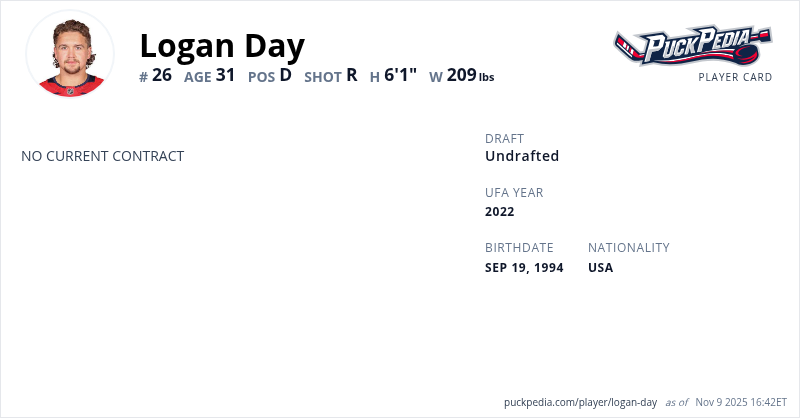 Logan Day is an Unrestricted Free Agent (No Qualifying Offer). His last contract was 1 year, $750,000 with a cap hit of $750,000 per season. It expired at the end of the 2019-20 season.