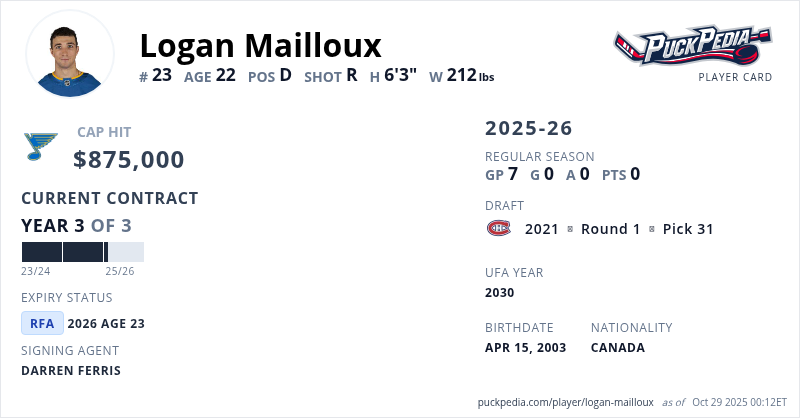 Logan Mailloux is signed to a 3 year, $2,625,000 contract with a cap hit of $875,000 per season, playing for the St. Louis Blues. His contract expires at the end of the 2025-26 season, making Mailloux a Restricted Free Agent.