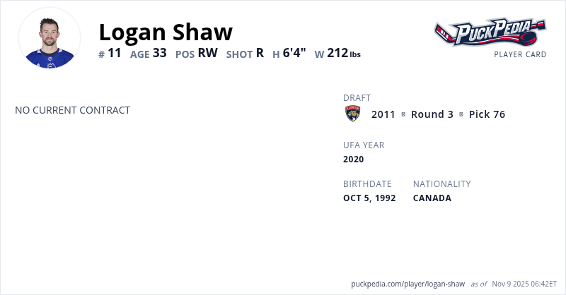 Logan Shaw is an Unrestricted Free Agent. His last contract was 2 years, $1,450,000 with a cap hit of $725,000 per season. It expired at the end of the 2021-22 season.