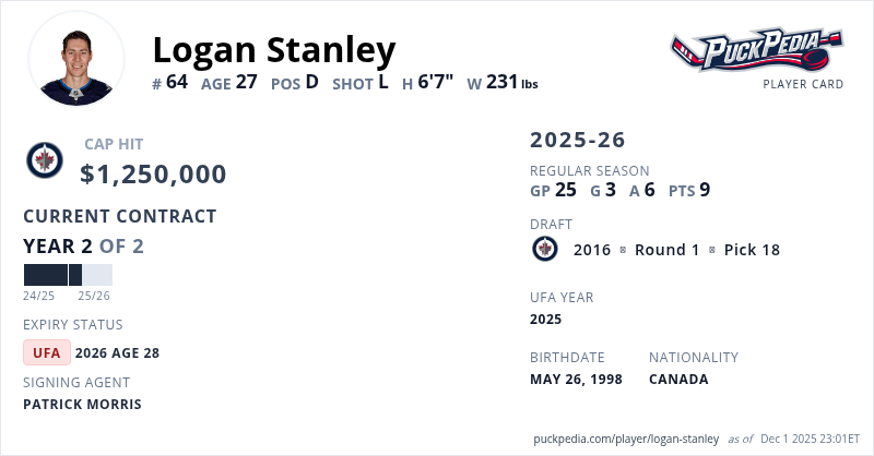 Logan Stanley is signed to a 2 year, $2,500,000 contract with a cap hit of $1,250,000 per season, playing for the Winnipeg Jets. His contract expires at the end of the 2025-26 season, making Stanley an Unrestricted Free Agent.