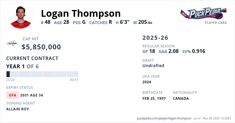 Logan Thompson is signed to a 6 year, $35,100,000 contract with a cap hit of $5,850,000 per season, playing for the Washington Capitals. His contract expires at the end of the 2030-31 season, making Thompson an Unrestricted Free Agent.
