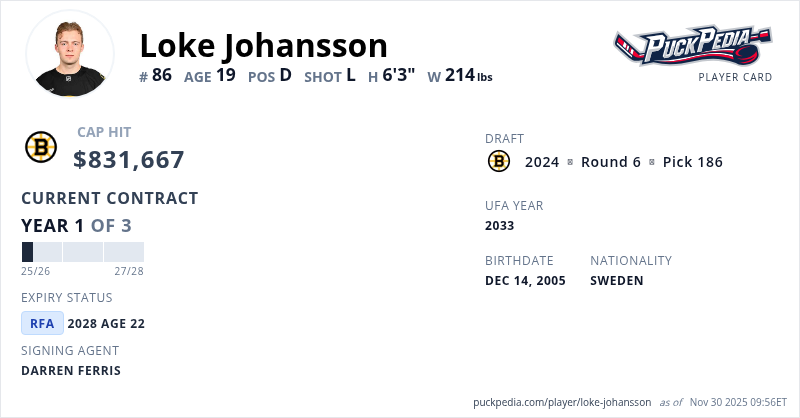 Loke Johansson is signed to a 3 year, $2,495,001 contract with a cap hit of $831,667 per season, playing for the Boston Bruins. His contract expires at the end of the 2027-28 season, making Johansson a Restricted Free Agent.