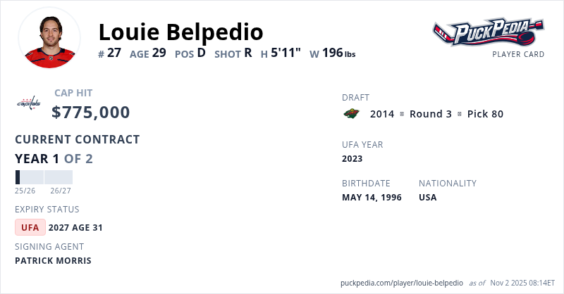Louie Belpedio is signed to a 2 year, $1,550,000 contract with a cap hit of $775,000 per season, playing for the Washington Capitals. His contract expires at the end of the 2026-27 season, making Belpedio an Unrestricted Free Agent.