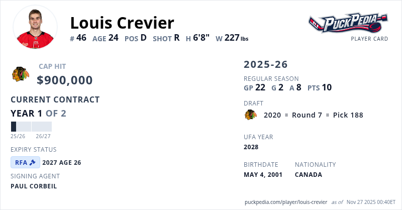 Louis Crevier is signed to a 2 year, $1,800,000 contract with a cap hit of $900,000 per season, playing for the Chicago Blackhawks. His contract expires at the end of the 2026-27 season, making Crevier a Restricted Free Agent.