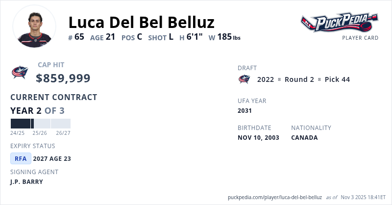 Luca Del Bel Belluz is signed to a 3 year, $2,579,997 contract with a cap hit of $859,999 per season, playing for the Columbus Blue Jackets. His contract expires at the end of the 2026-27 season, making Del Bel Belluz a Restricted Free Agent.