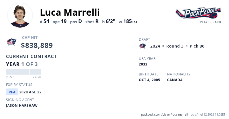 Luca Marrelli is signed to a 3 year, $2,516,667 contract with a cap hit of $838,889 per season, playing for the Columbus Blue Jackets. His contract expires at the end of the 2027-28 season, making Marrelli a Restricted Free Agent.