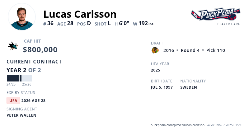Lucas Carlsson is signed to a 2 year, $1,600,000 contract with a cap hit of $800,000 per season, playing for the San Jose Sharks. His contract expires at the end of the 2025-26 season, making Carlsson an Unrestricted Free Agent.