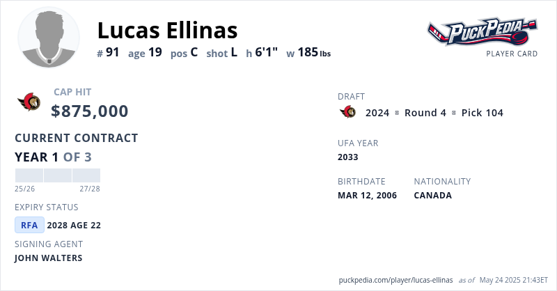 Lucas Ellinas is signed to a 3 year, $2,625,000 contract with a cap hit of $875,000 per season, playing for the Ottawa Senators. His contract expires at the end of the 2027-28 season, making Ellinas a Restricted Free Agent.