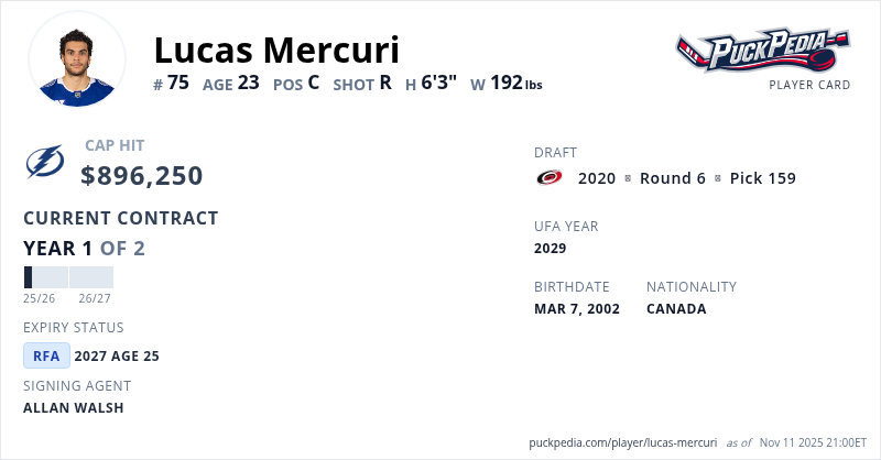 Lucas Mercuri is signed to a 2 year, $1,792,500 contract with a cap hit of $896,250 per season, playing for the Tampa Bay Lightning. His contract expires at the end of the 2026-27 season, making Mercuri a Restricted Free Agent.
