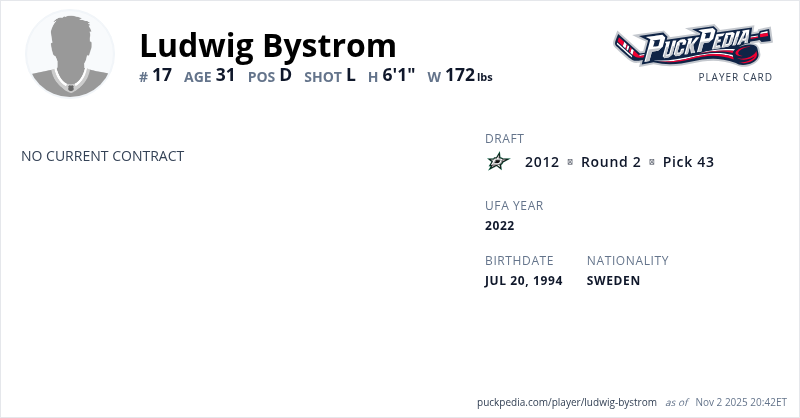 Ludwig Bystrom is an Unrestricted Free Agent. His last contract was 1 year, $650,000 with a cap hit of $650,000 per season. It expired at the end of the 2018-19 season.